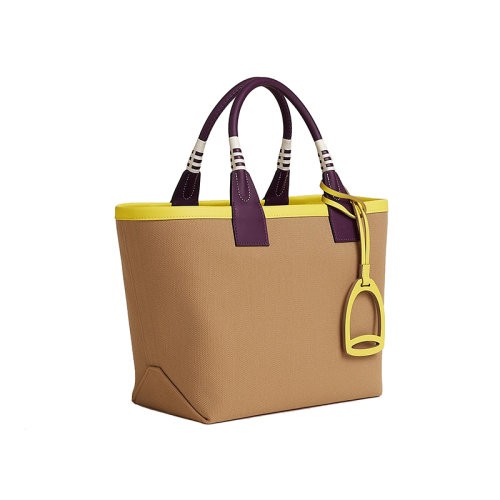 【包税】HERMES/爱马仕24新款 女士栗色帆布黄色皮马镫型手提包H083618CKAC